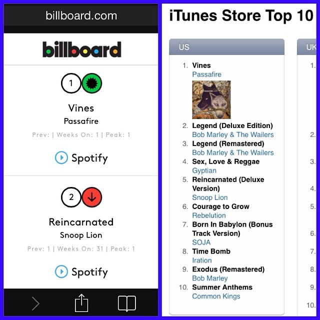 Vines – #1 Reggae Album on Billboard & iTunes Posted on 11.24.13 by GooZe Productions in PASSAFIRE We debuted #1 Reggae Album on Billboard & iTunes! Click here to order your copy. Share this: Click to share on Facebook (Opens in new window) Facebook Click to share on X (Opens in new window) X Click to email a link to a friend (Opens in new window) Email Like Loading... Related